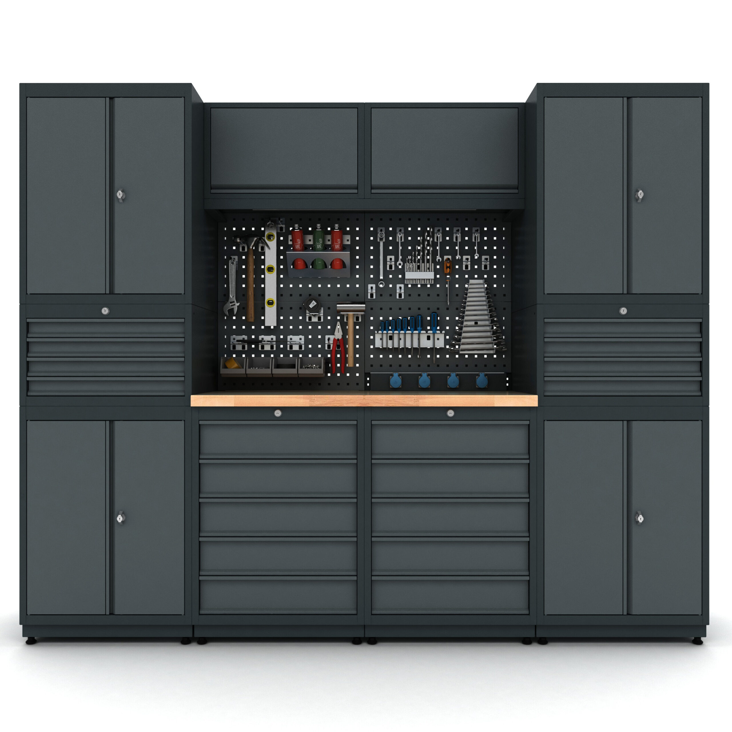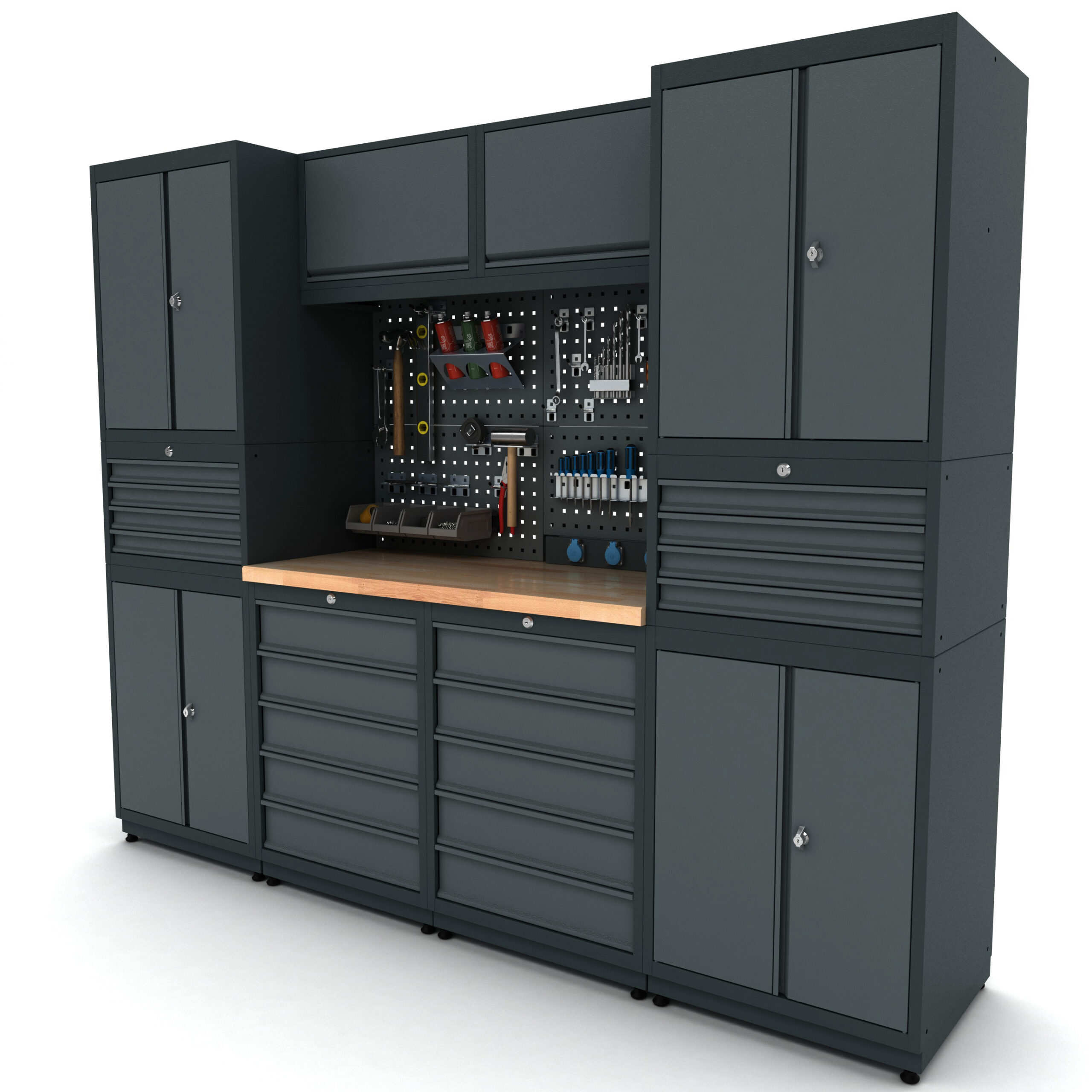 Bütün çekmece ve kapaklar kilitlenebilir özelliktedir. Ağır malzemelerin depolanacağı çekmecelerde teleskopik ray kullanılmıştır ve çekmecelerin sağlamlığı arttırılmıştır.