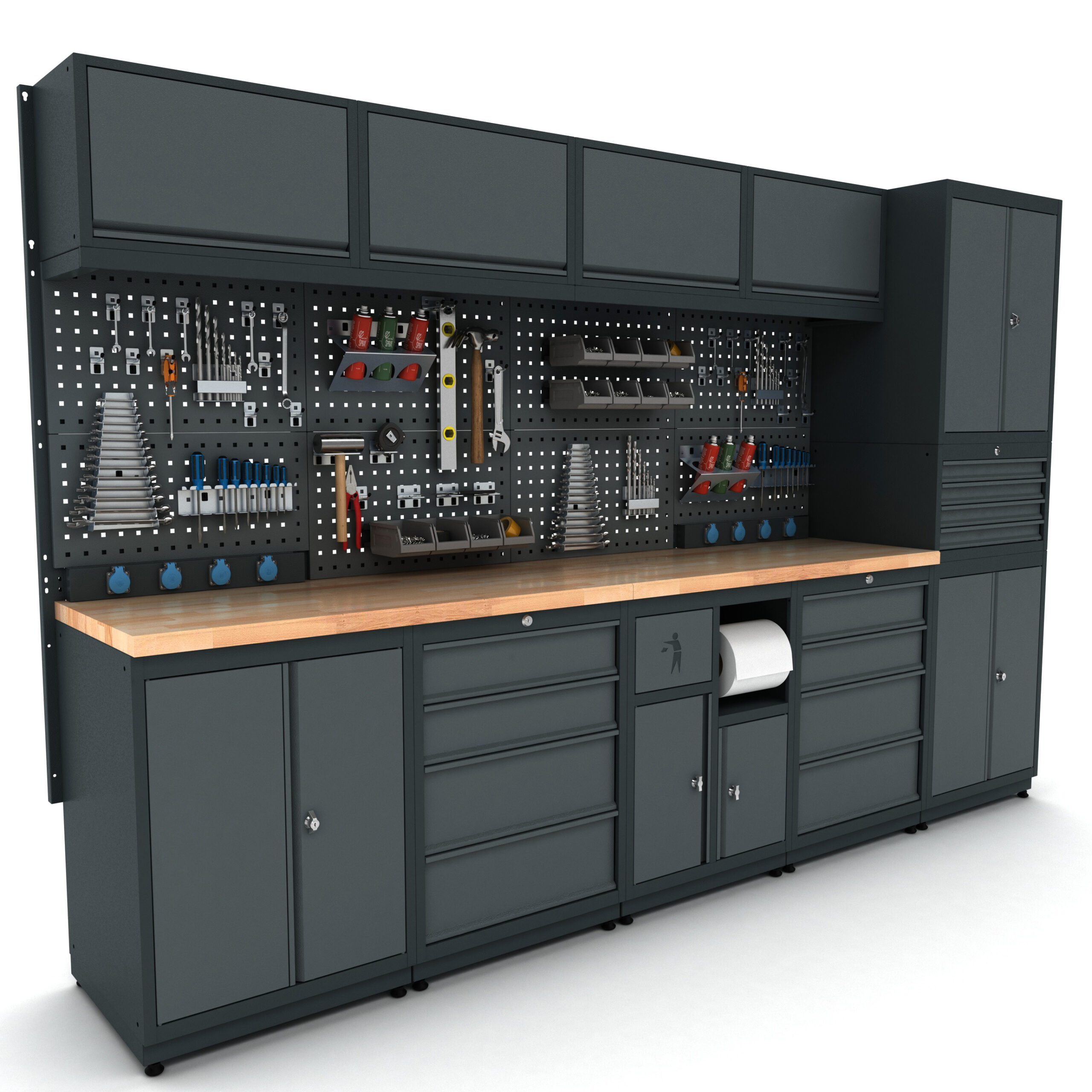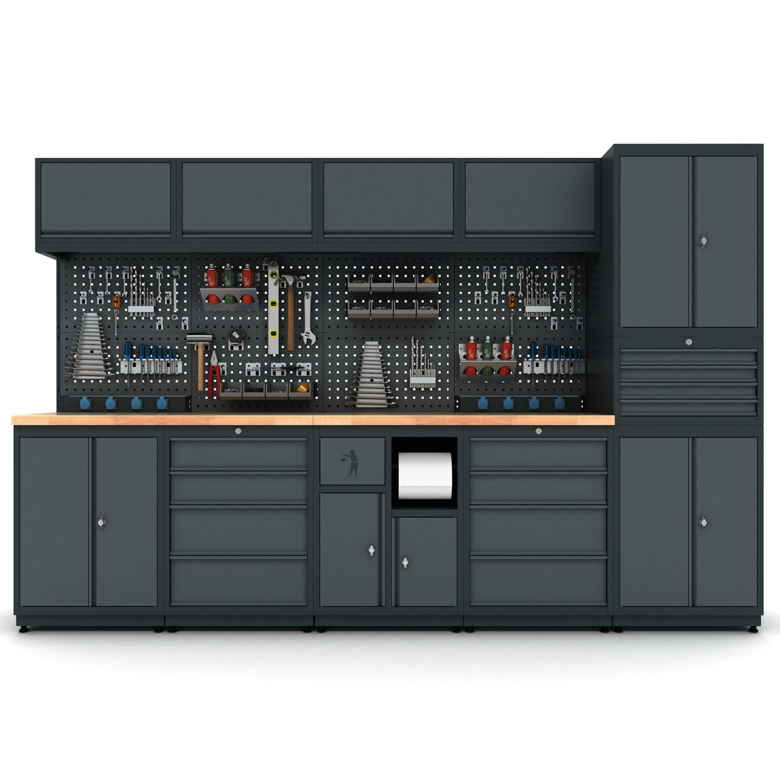 Bütün çekmece ve kapaklar kilitlenebilir özelliktedir. Ağır malzemelerin depolanacağı çekmecelerde teleskopik ray kullanılmıştır ve çekmecelerin sağlamlığı arttırılmıştır.