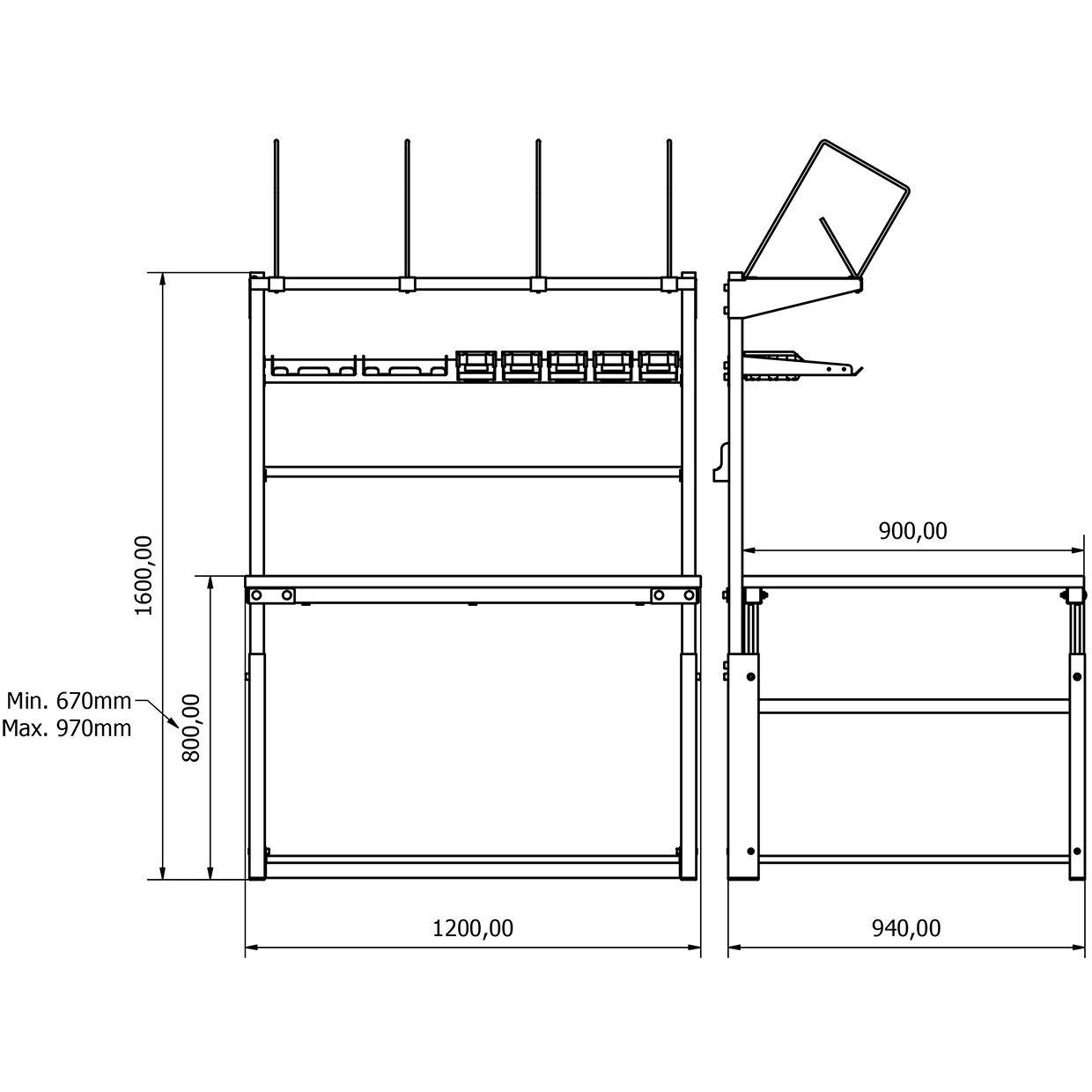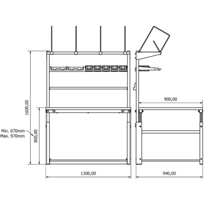 - Yükseklik Ayarı: Manuel olarak ayarlanabilir. Tabla yüksekliği zeminden 670 mm ile 970 mm arasında ayarlanabilir