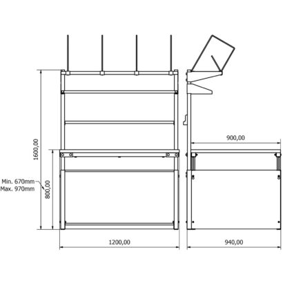 - Yükseklik Ayarı: Manuel olarak ayarlanabilir. Tabla yüksekliği zeminden 670 mm ile 970 mm arasında ayarlanabilir