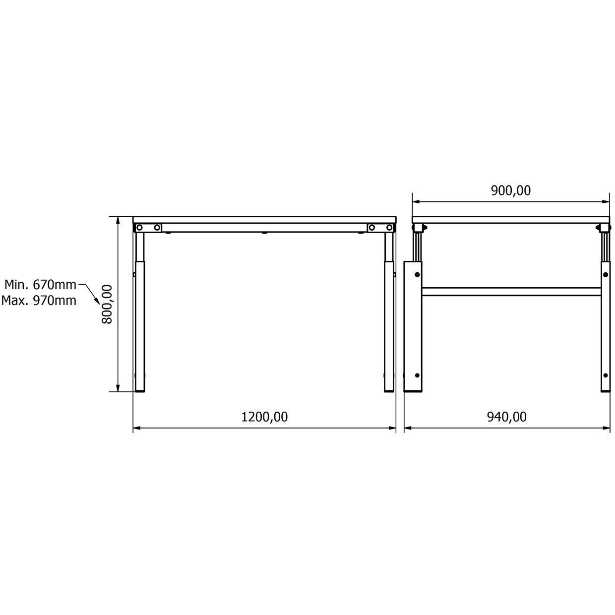 • Yükseklik Ayarı: Manuel olarak ayarlanabilir. Tabla yüksekliği zeminden 670 mm ile 970 mm arasında ayarlanabilir