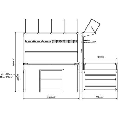- Yükseklik Ayarı: Manuel olarak ayarlanabilir. Tabla yüksekliği zeminden 670 mm ile 970 mm arasında ayarlanabilir