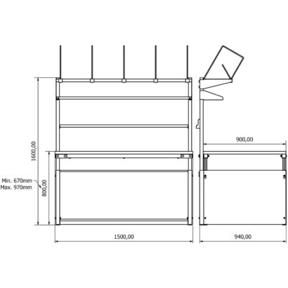 • Yükseklik Ayarı: Manuel olarak ayarlanabilir. Tabla yüksekliği zeminden 670 mm ile 970 mm arasında ayarlanabilir