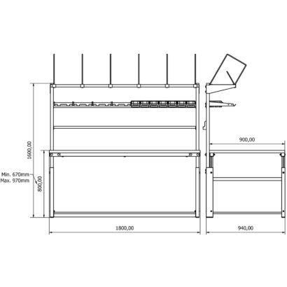 - Yükseklik Ayarı: Manuel olarak ayarlanabilir. Tabla yüksekliği zeminden 670 mm ile 970 mm arasında ayarlanabilir