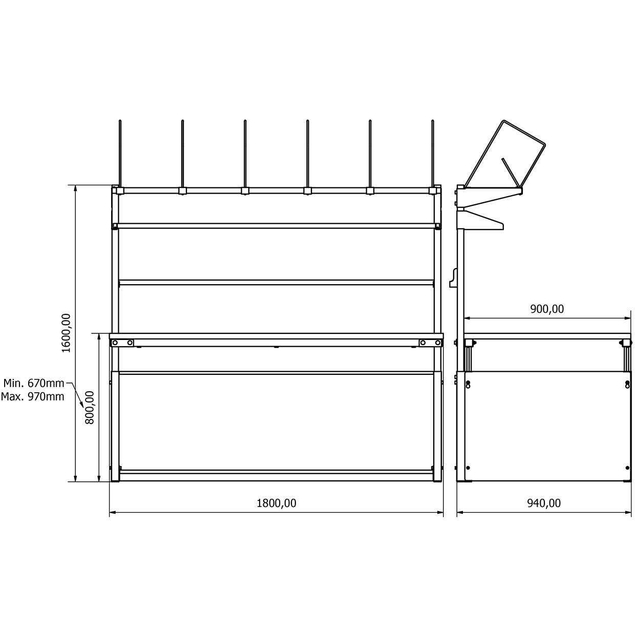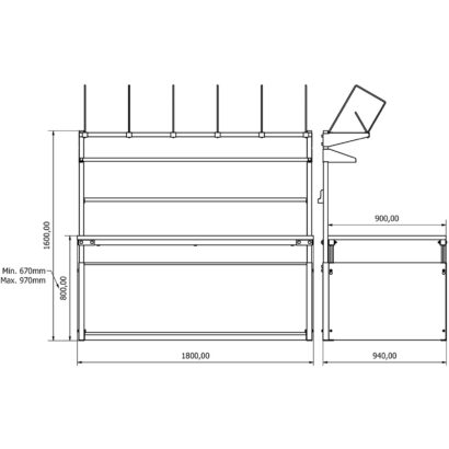 - Yükseklik Ayarı: Manuel olarak ayarlanabilir. Tabla yüksekliği zeminden 670 mm ile 970 mm arasında ayarlanabilir