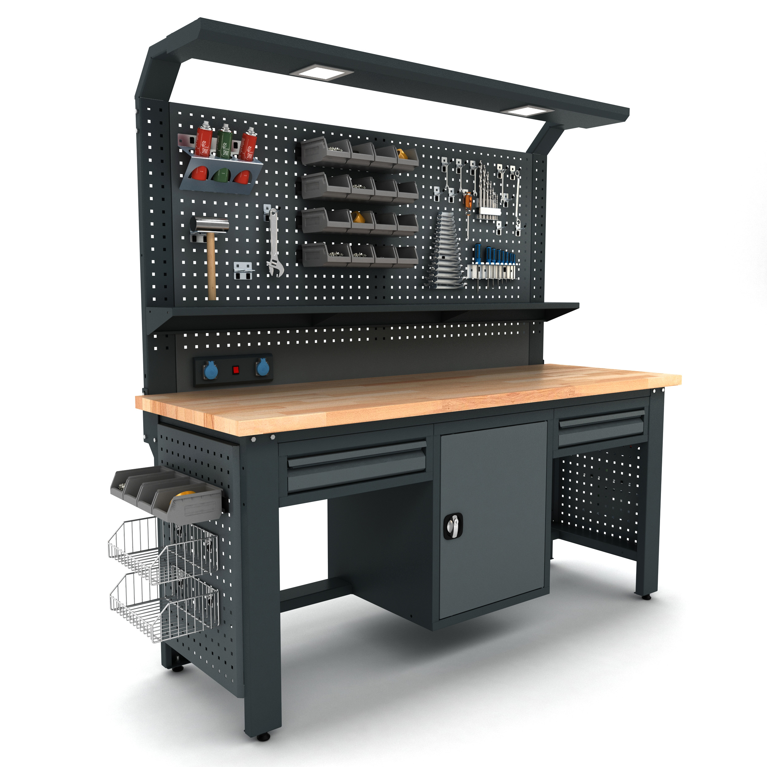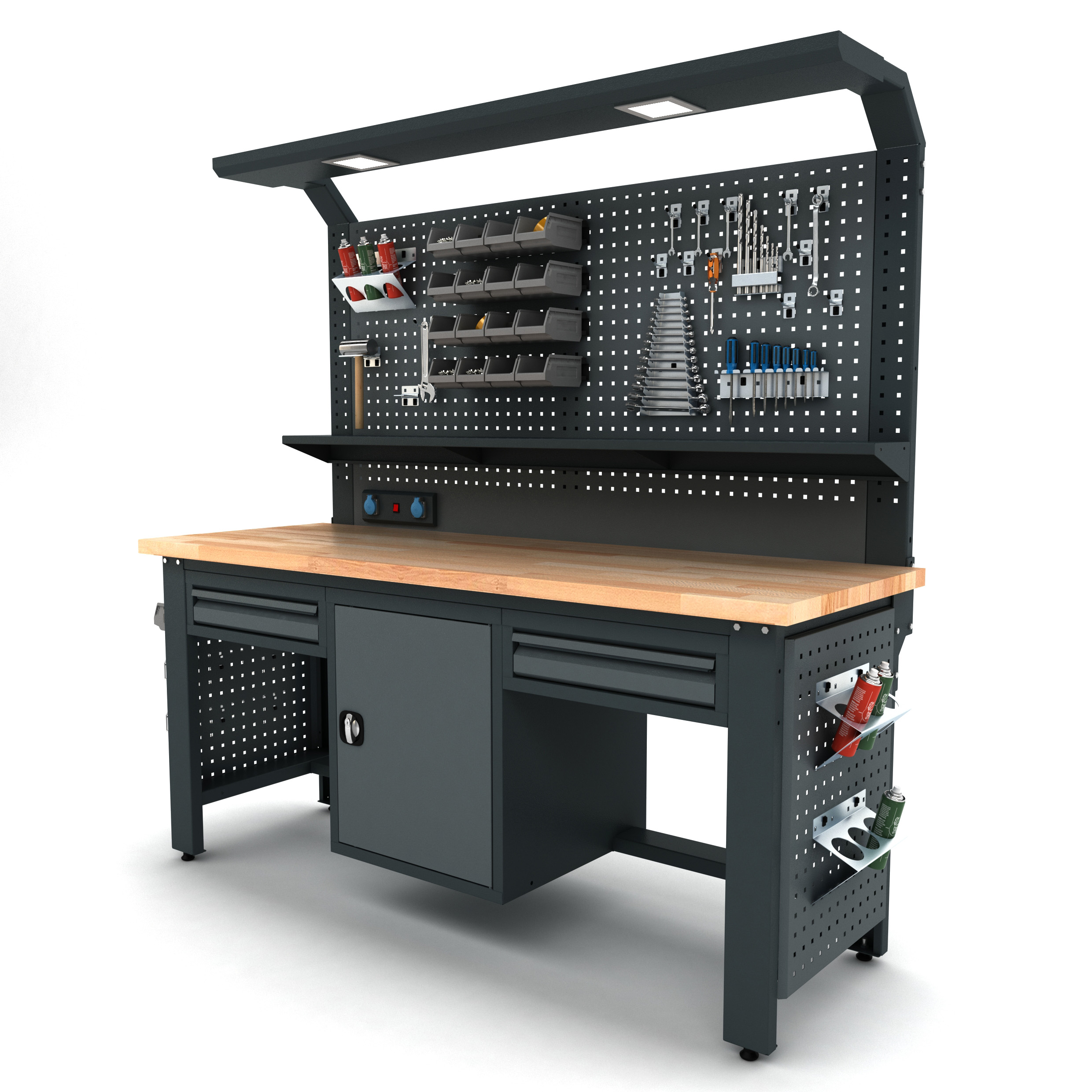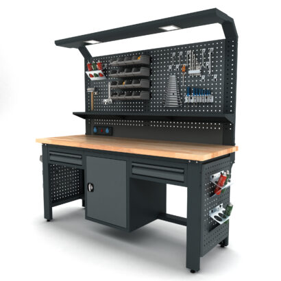 Masif kayın tabla, sağlam sac gövde. Yoğun kullanıma uygun Proline Plus çalışma tezgahı.