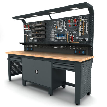 Masif kayın tabla, sağlam sac gövde. Yoğun kullanıma uygun Proline Plus çalışma tezgahı.