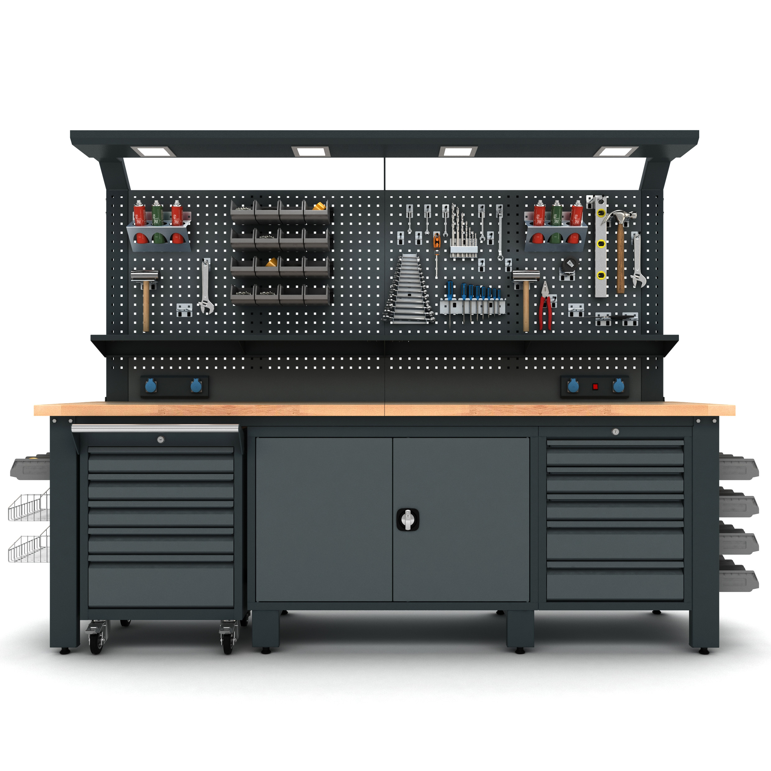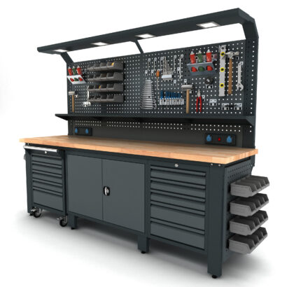 Masif kayın tabla, sağlam sac gövde. Yoğun kullanıma uygun Proline Plus çalışma tezgahı.